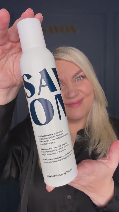 StaySet hiuskiinne suojaa kampausta kosteudelta ja hiuksia niin muotoilulaitteiden lämmöltä kuin UV-säteilyltä. Suihkuta kaukaa jos haluat kevyen pidon ja lähempää saadaksesi napakamman tuen.